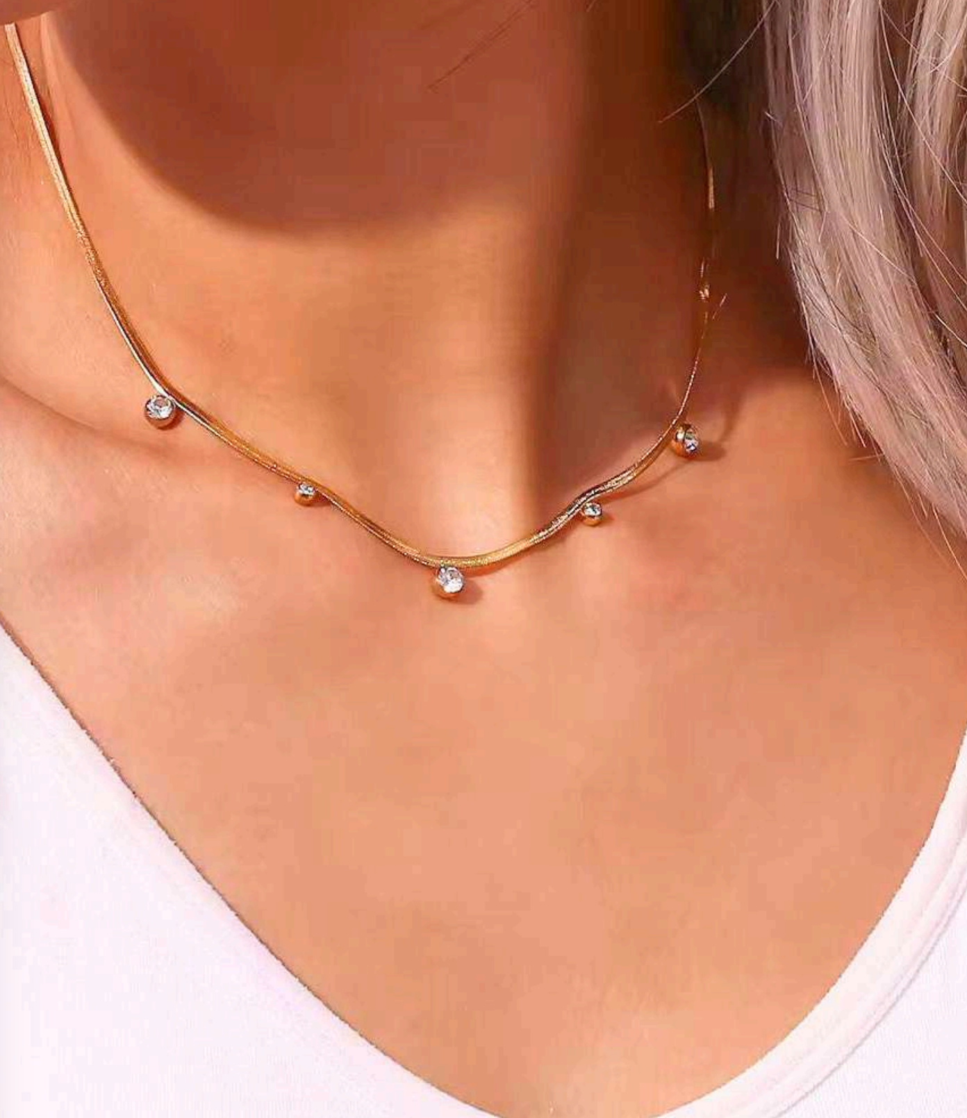 Elevate your look with the Celeste Dazzle Necklace — a delicate gold-toned chain adorned with shimmering crystal accents that catch the light beautifully. Designed to sit gracefully along the collarbone, this necklace is perfect for layering or wearing solo as a statement of understated luxury.