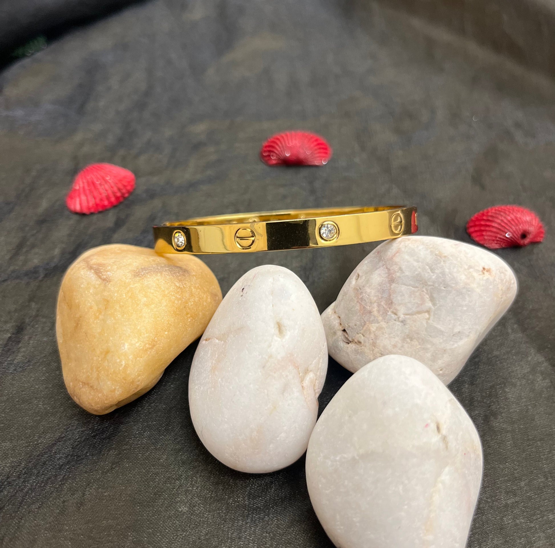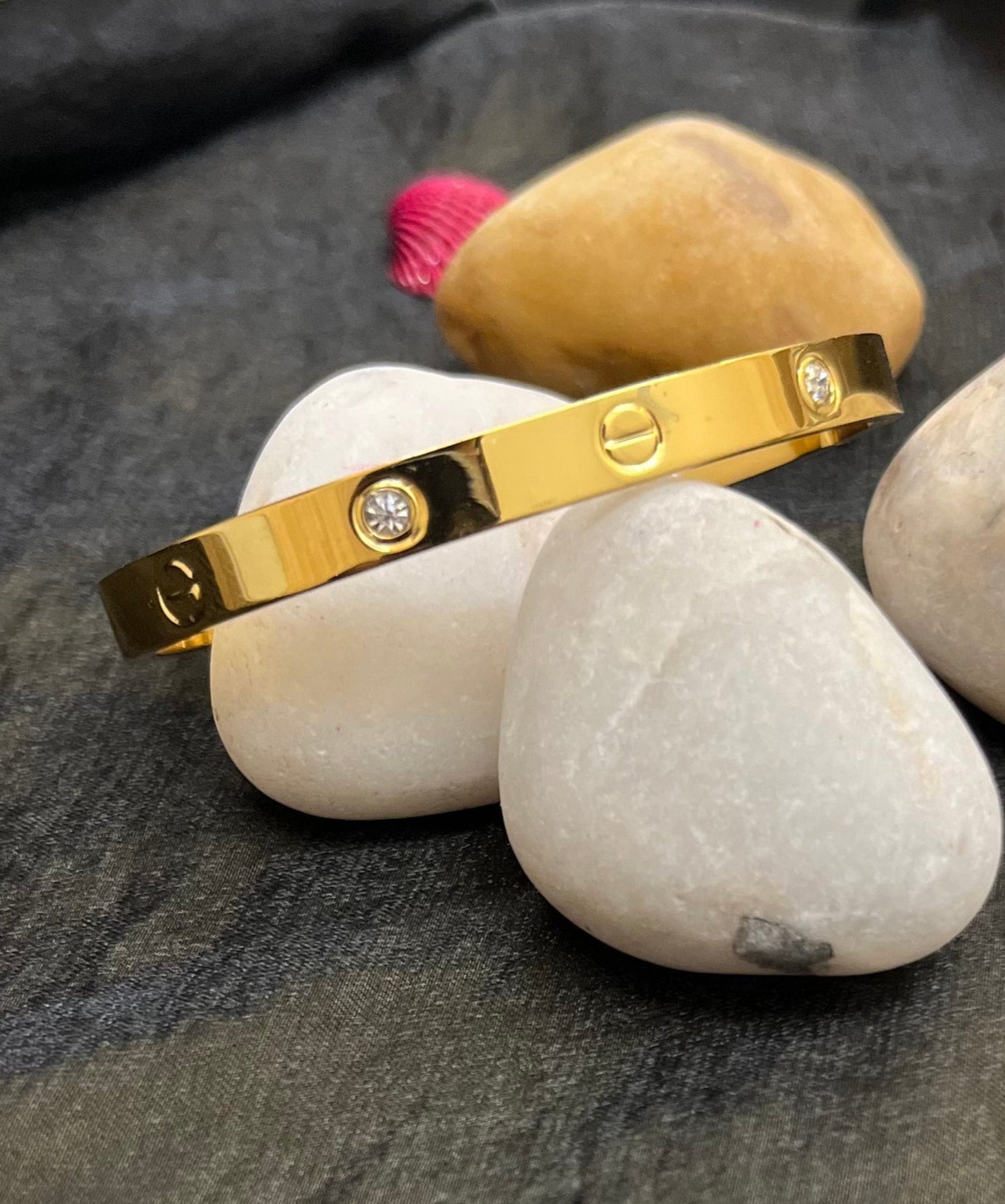Redefine elegance with our Eternal Love Gold-Plated Bangle. Featuring signature screw motifs and subtle stone detailing, this bangle is a symbol of everlasting charm.