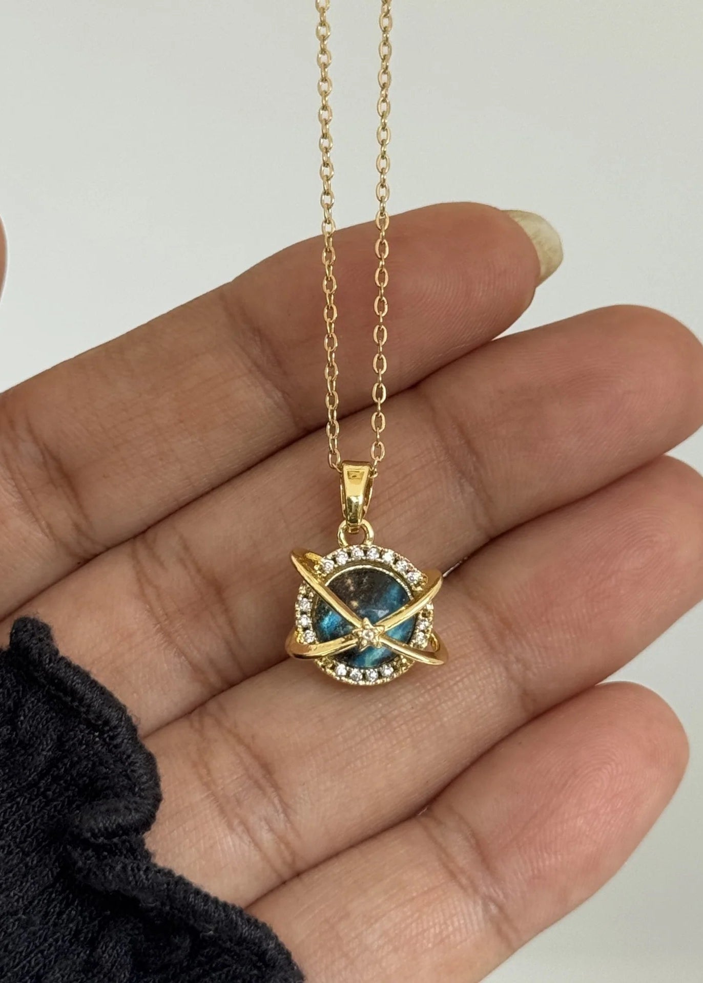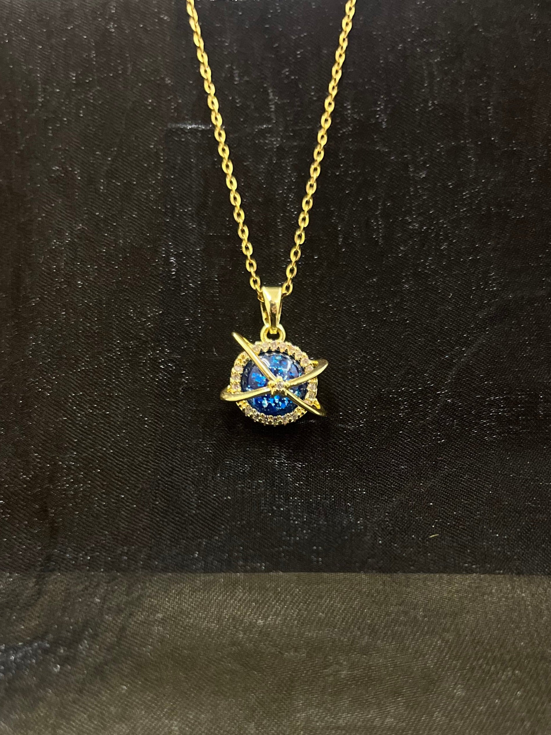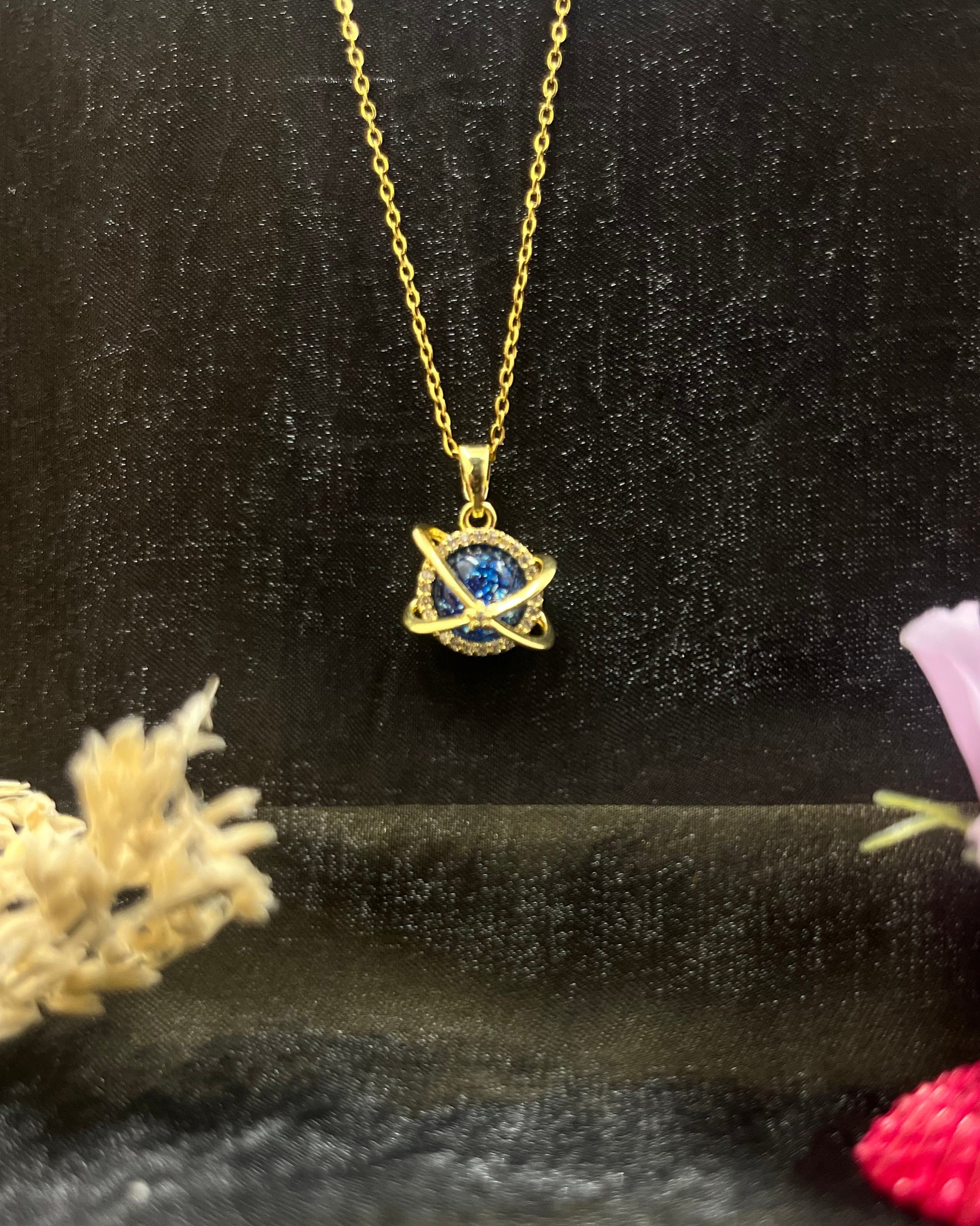 Step into a galaxy of style with our Cosmic Orbit Gold-Plated Pendant. Featuring a dazzling deep-blue stone encased in orbit-like golden rings, this necklace is a true statement of elegance and individuality.