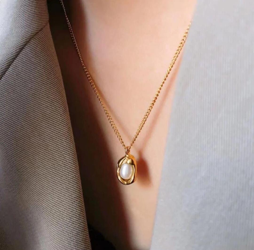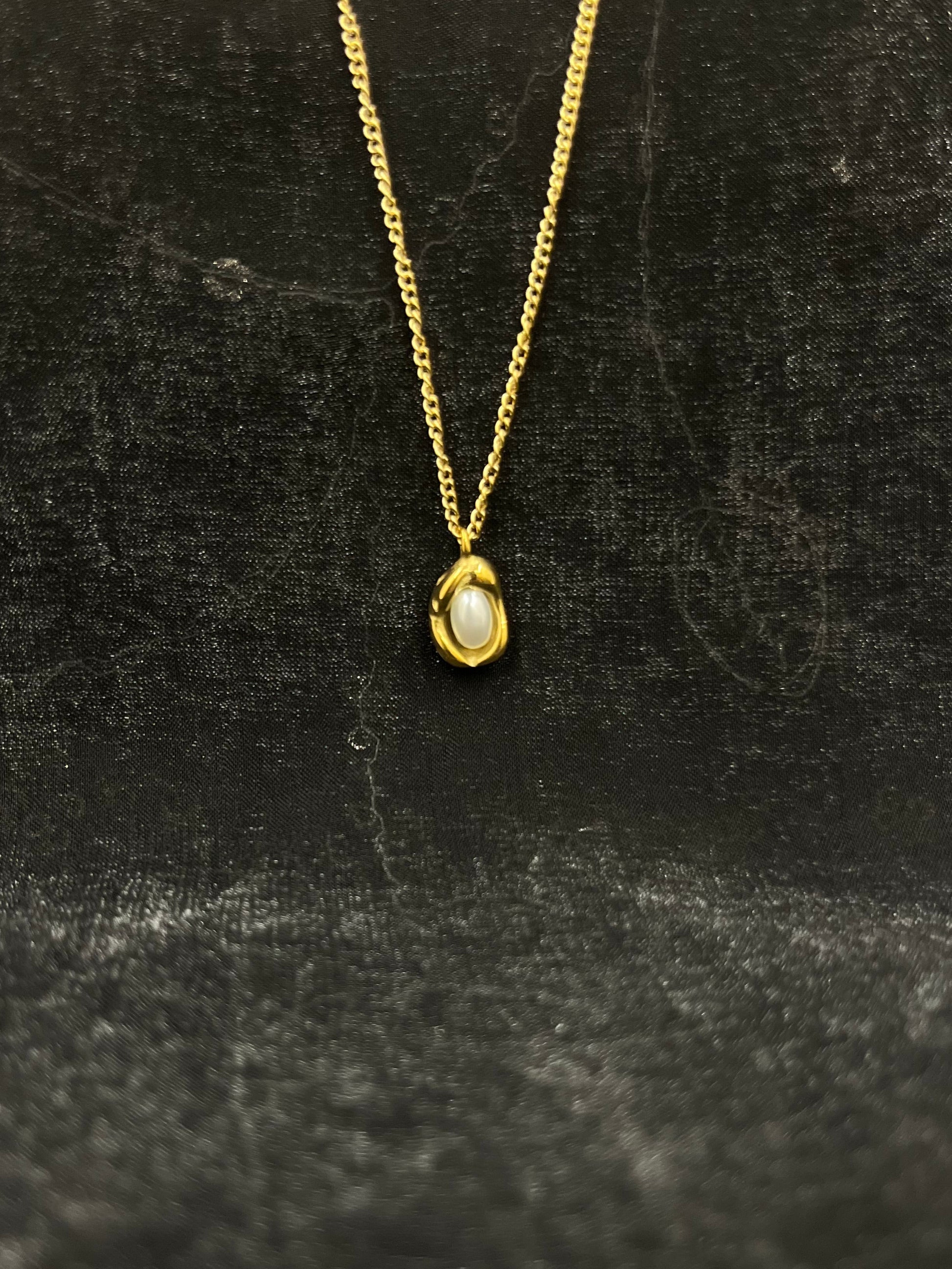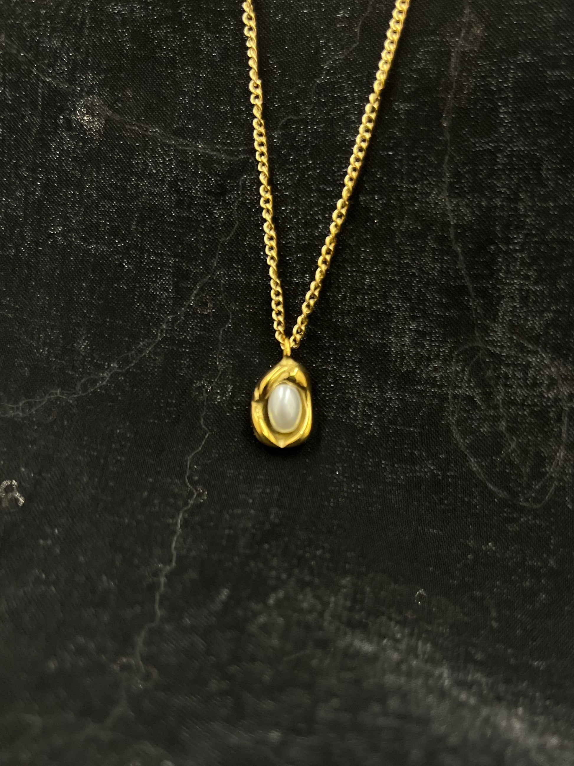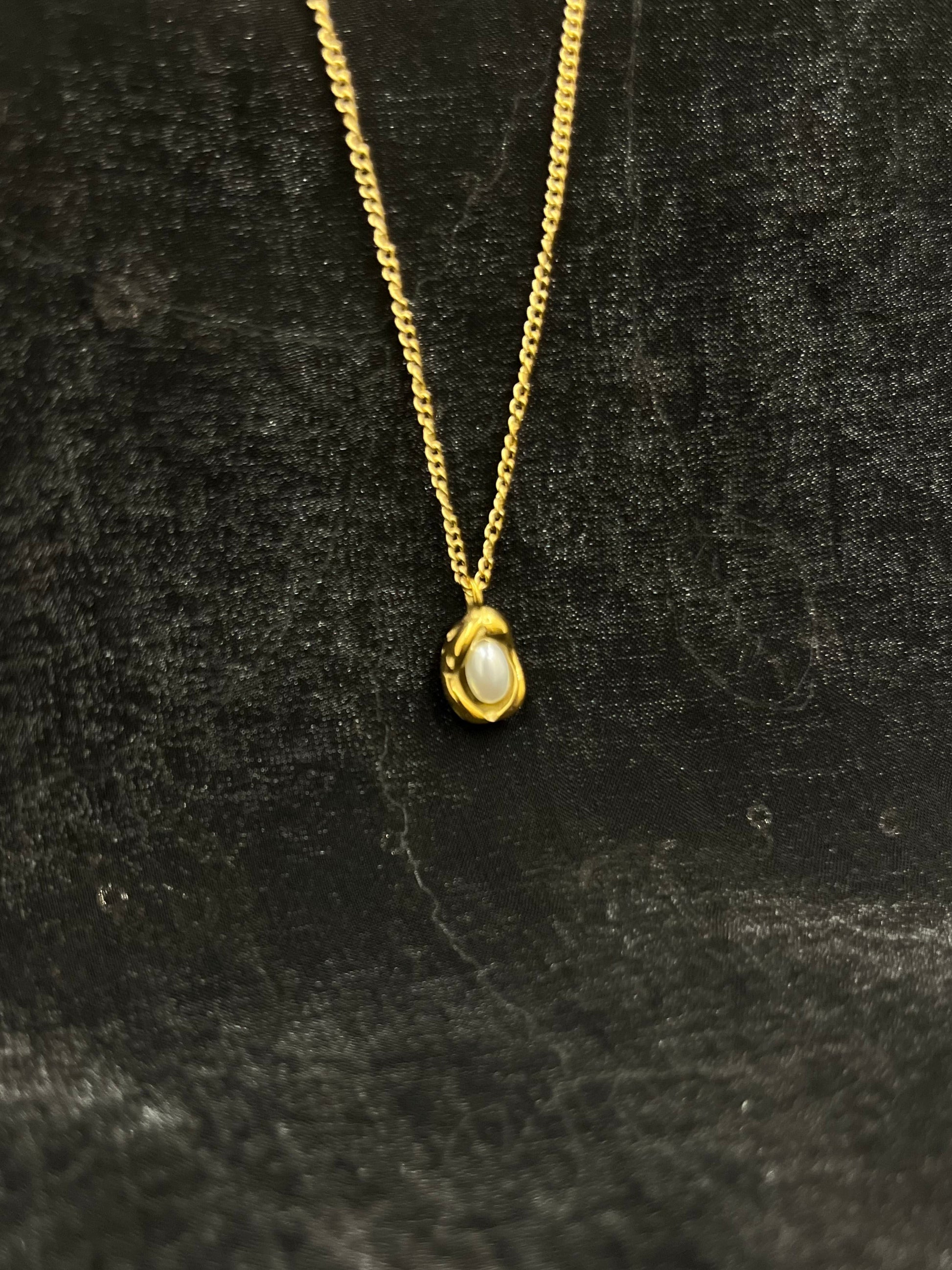 This is a lovely piece — a gold-toned necklace with a small pearl-like pendant framed in an organic, slightly irregular design. ✨