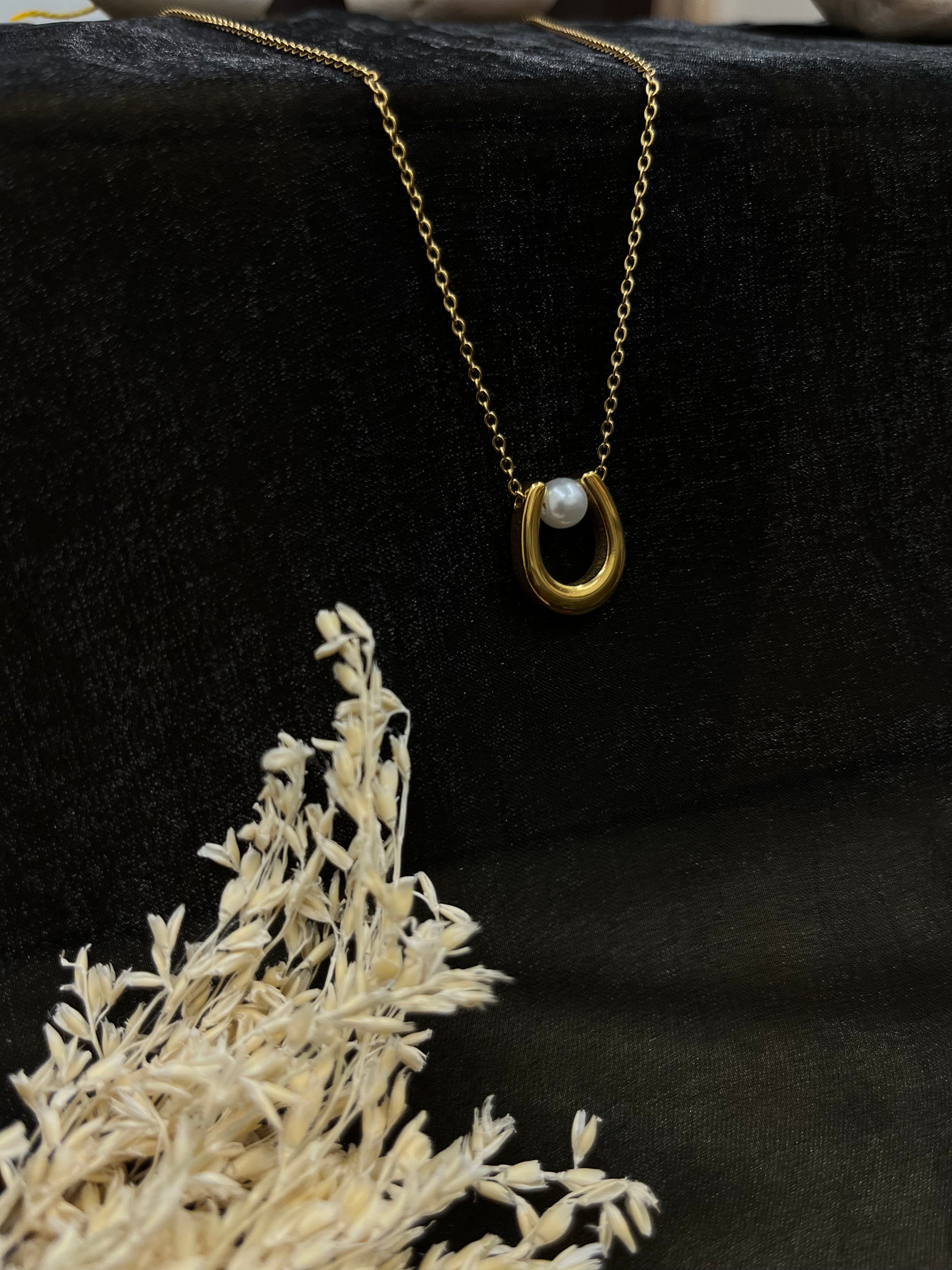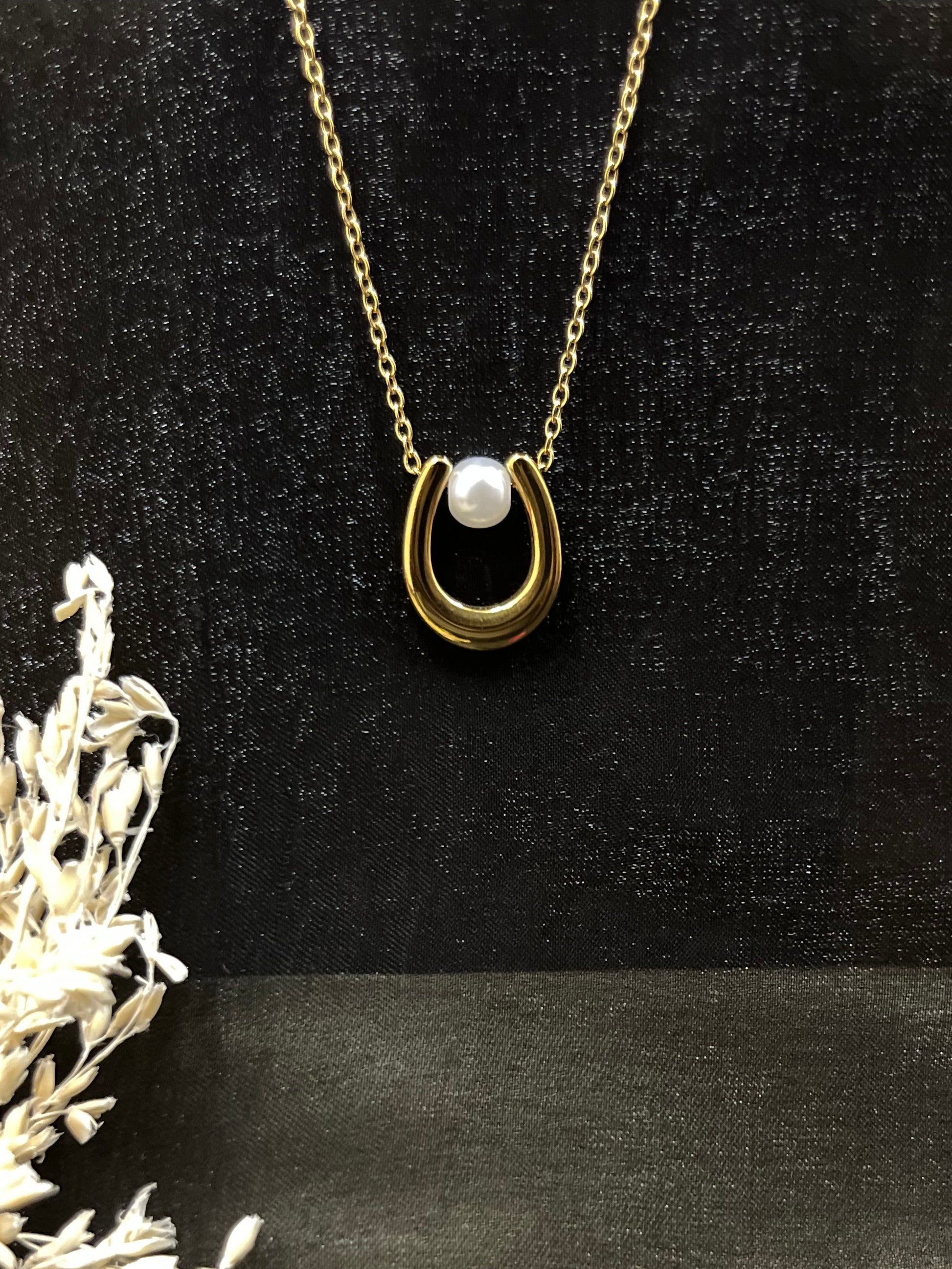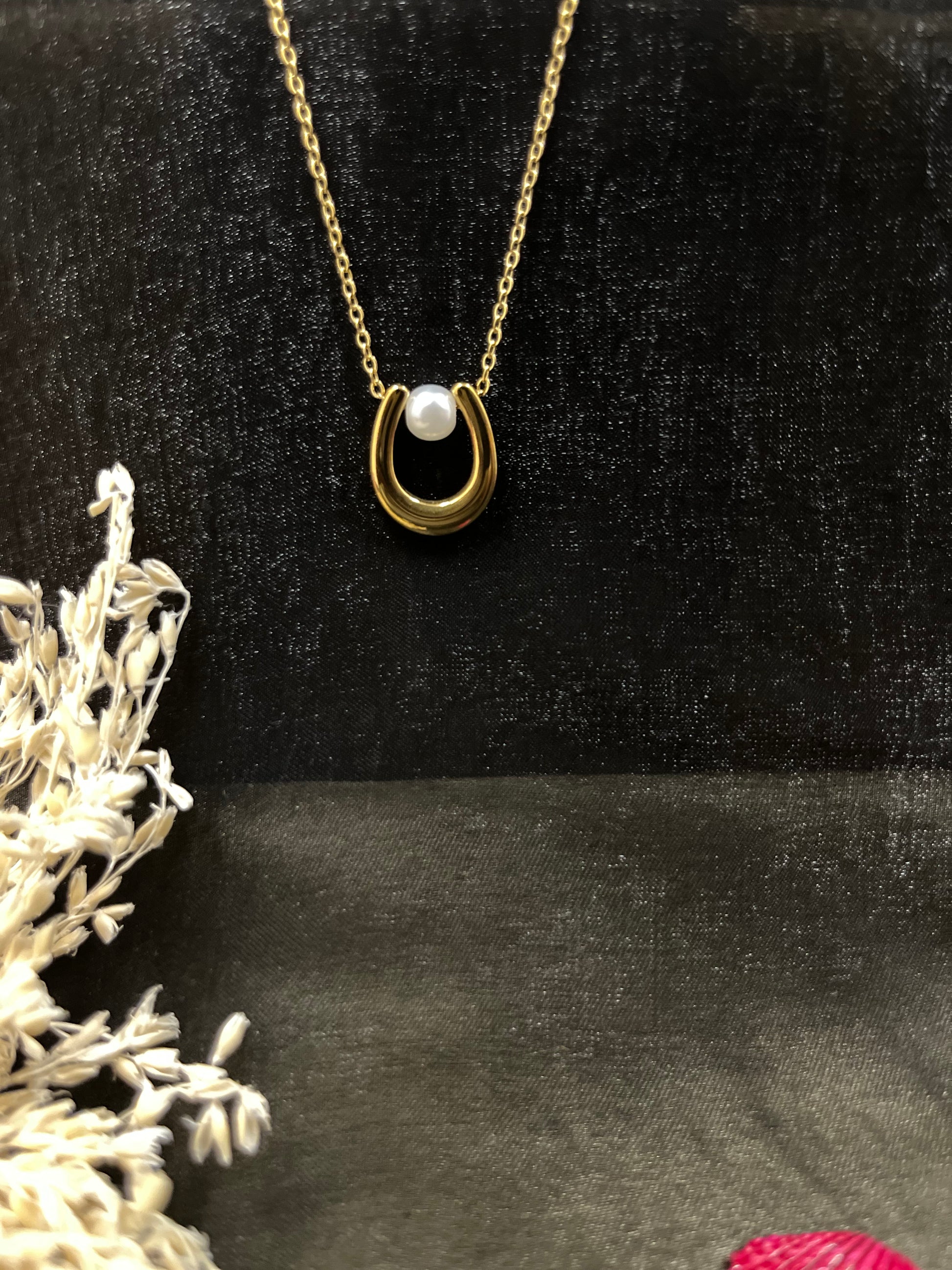 Add a touch of timeless sophistication to your look with this beautifully crafted gold pendant necklace. Featuring a sleek, horseshoe-shaped pendant in polished gold, this piece is elegantly accented by a single luminous pearl delicately nestled within. Suspended from a fine gold chain, this necklace effortlessly balances modern design with classic charm.