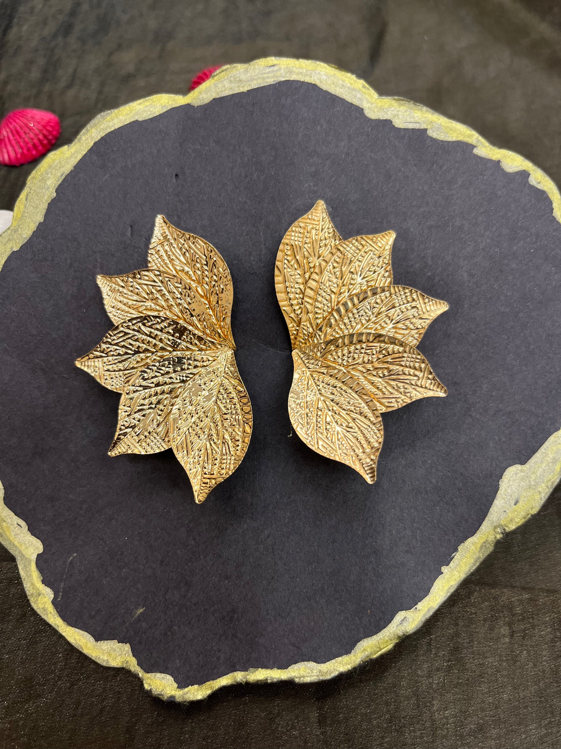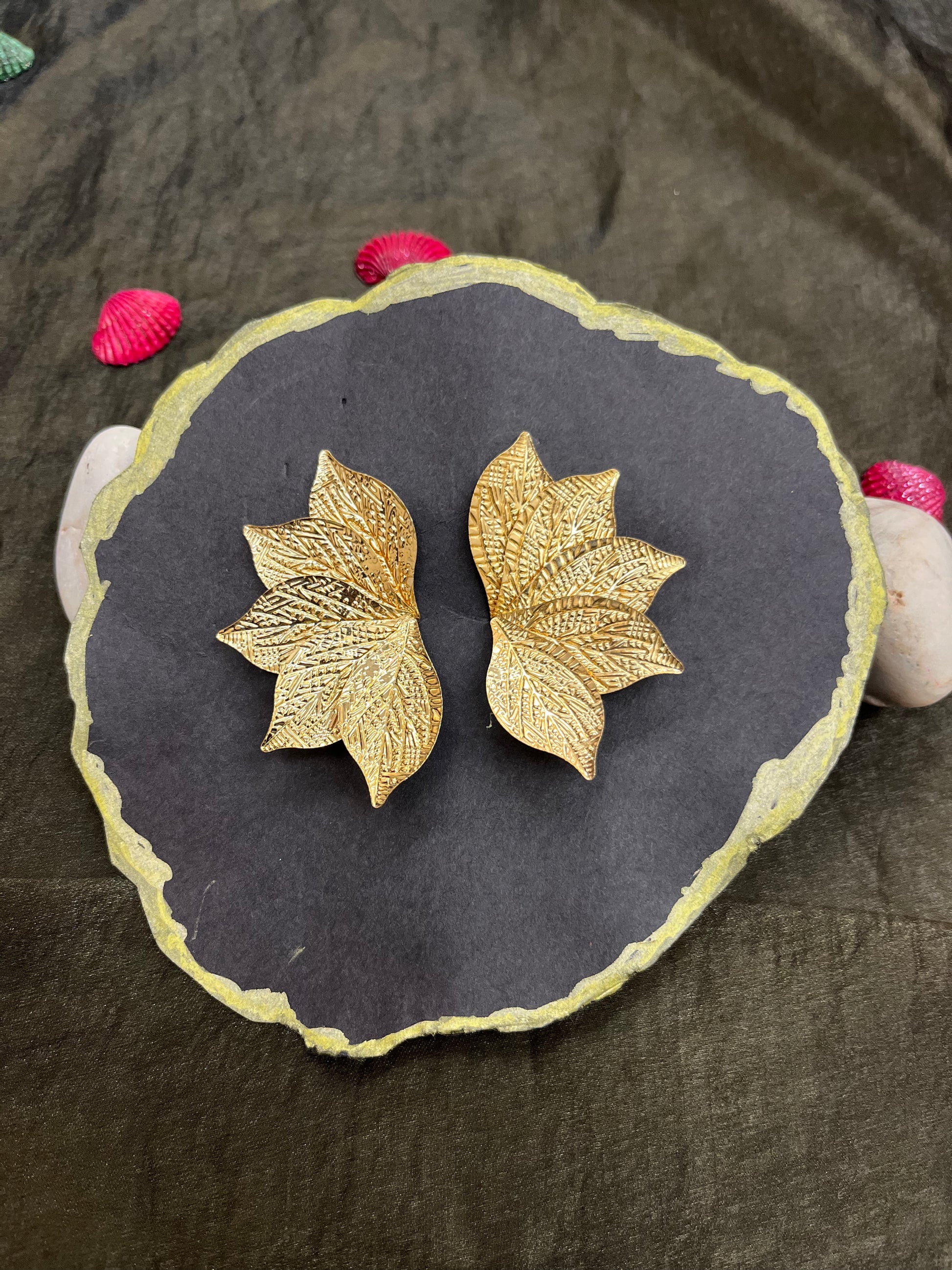 Design: Oversized leaf motif studs with textured detailing