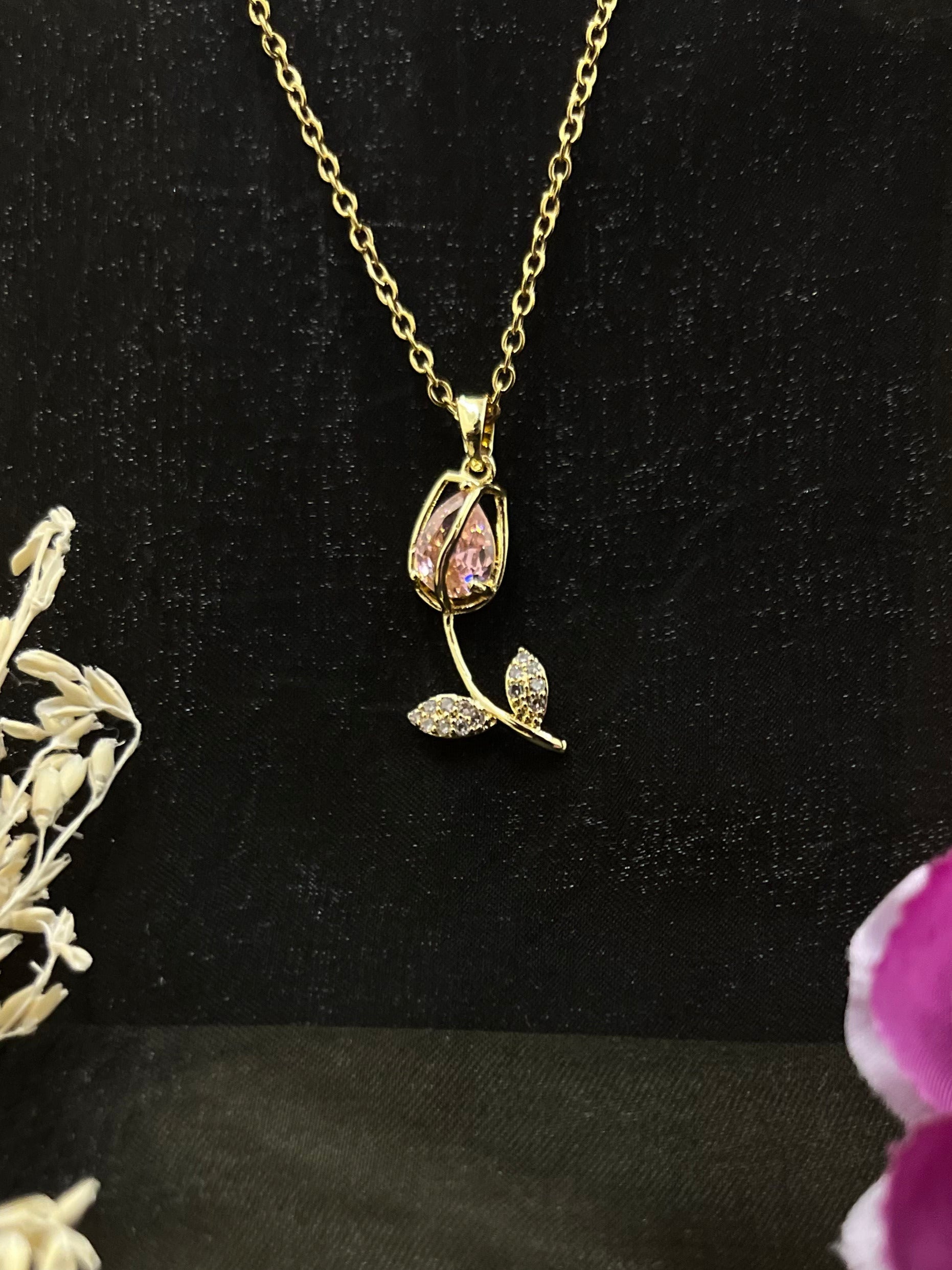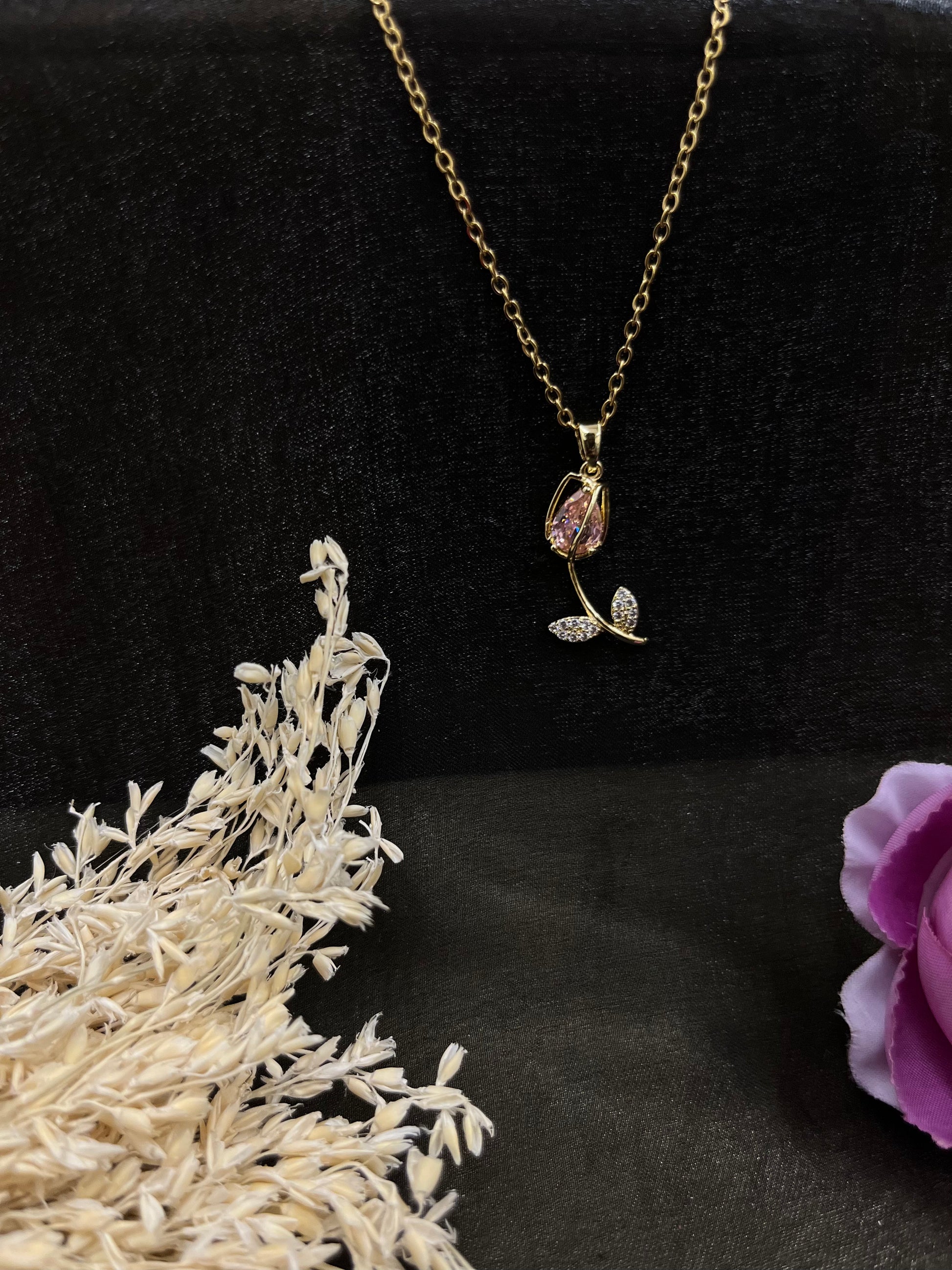A timeless symbol of love and beauty, this elegant necklace features a delicately crafted rose pendant. The rosebud is adorned with a shimmering pink stone, cradled in a gold-tone frame, while the stem is accented with sparkling crystal leaves for an extra touch of elegance. Suspended from a refined gold-tone chain, this piece exudes femininity and grace.