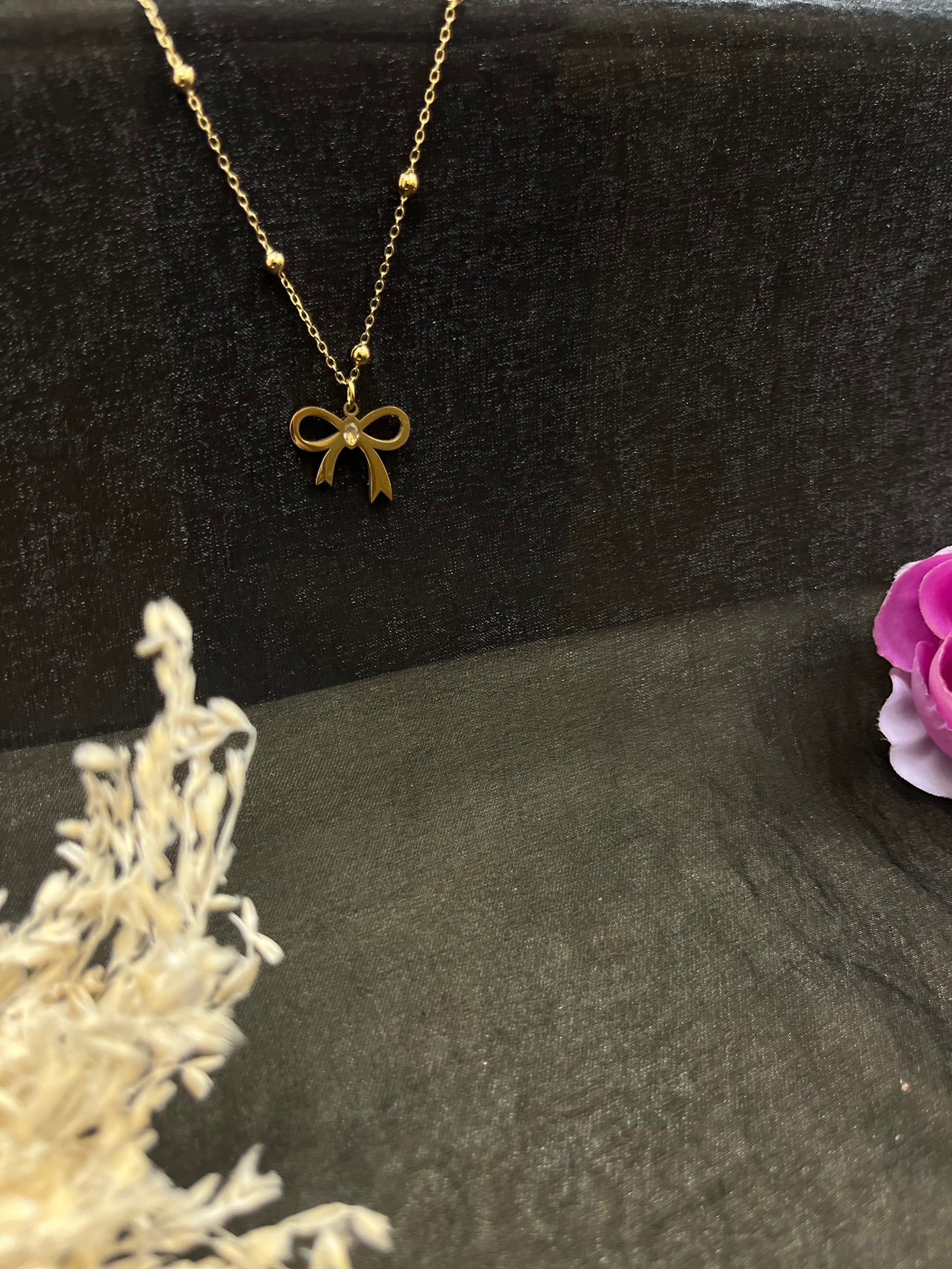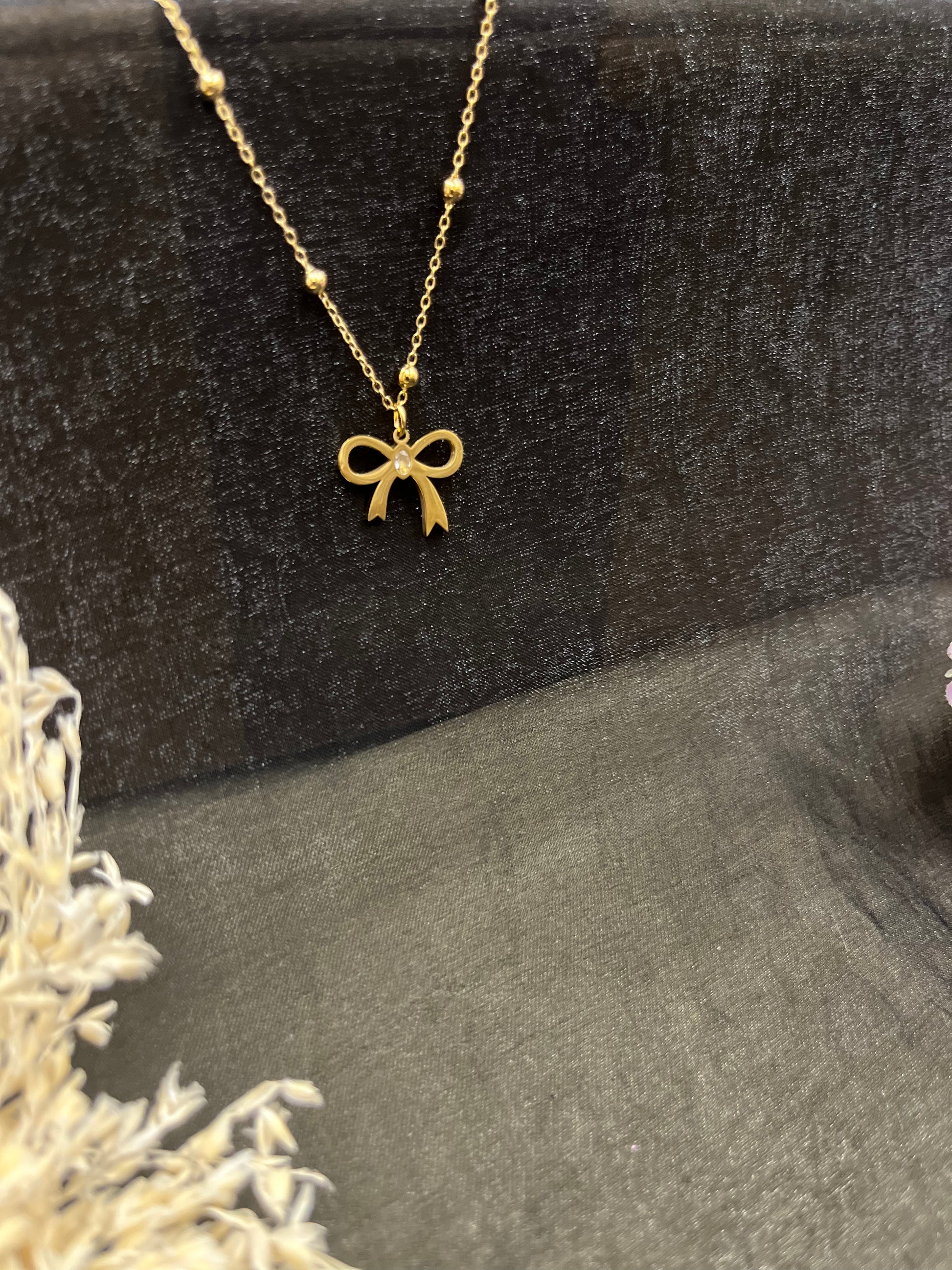 Our Petite Bow Charm Necklace is crafted for those who love delicate details. With its sleek golden bow and dainty chain adorned with bead accents, this necklace is the perfect blend of playful femininity and timeless elegance.