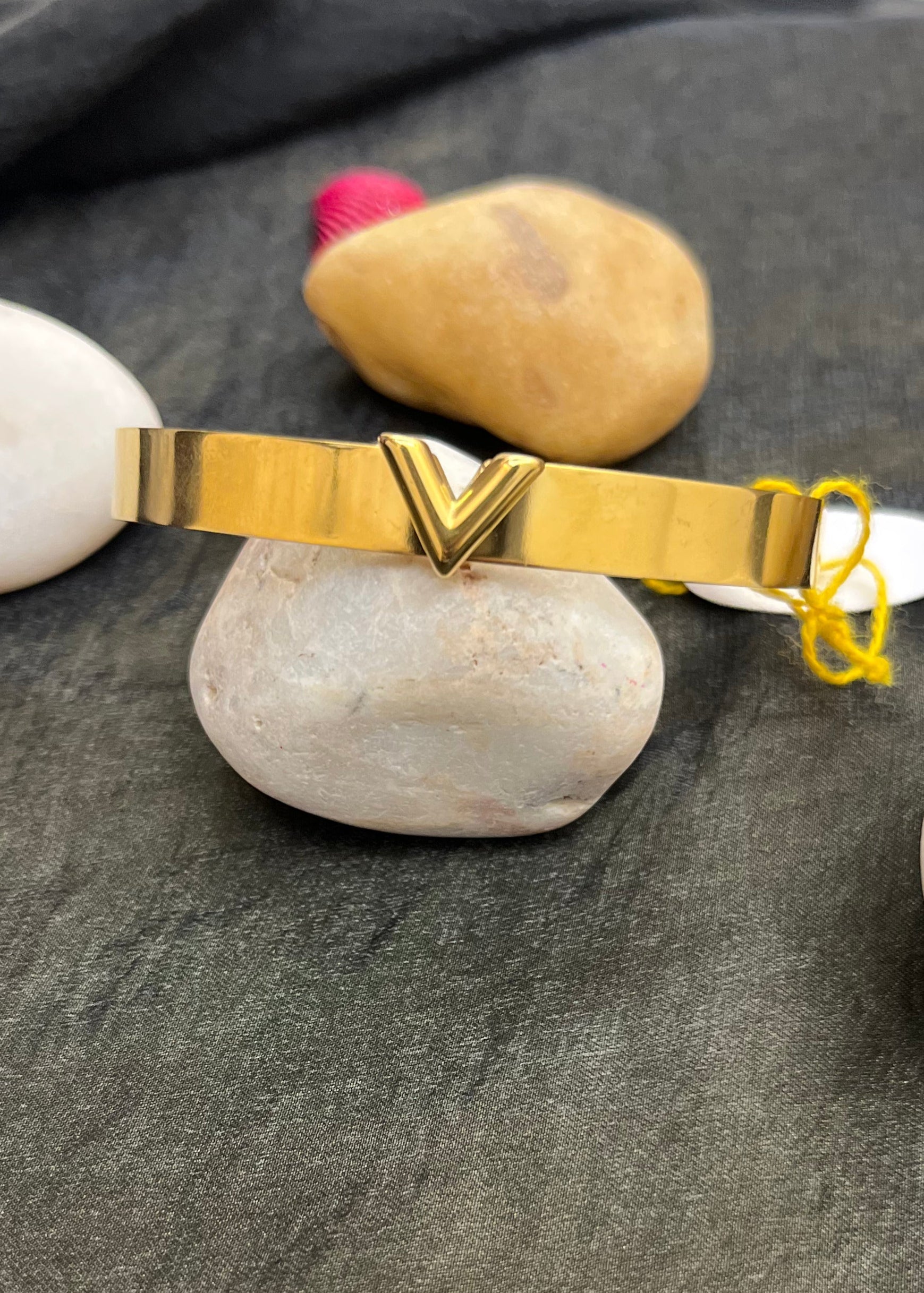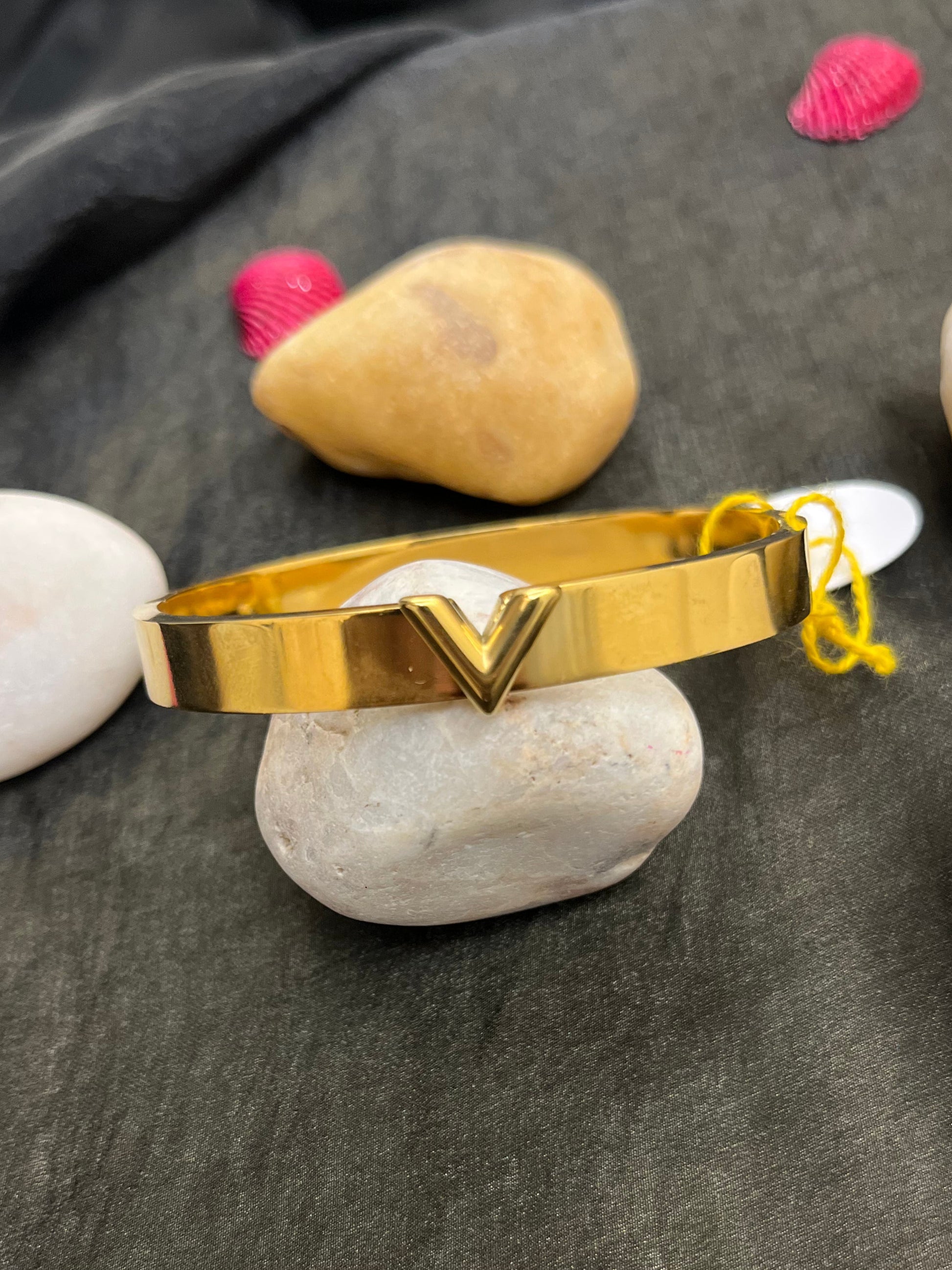 Minimal yet powerful, our Victory Gold-Plated Bangle is a true symbol of strength and style. Featuring a sleek “V” design at the center, this piece is crafted for women who love jewellery that makes a statement without trying too hard.